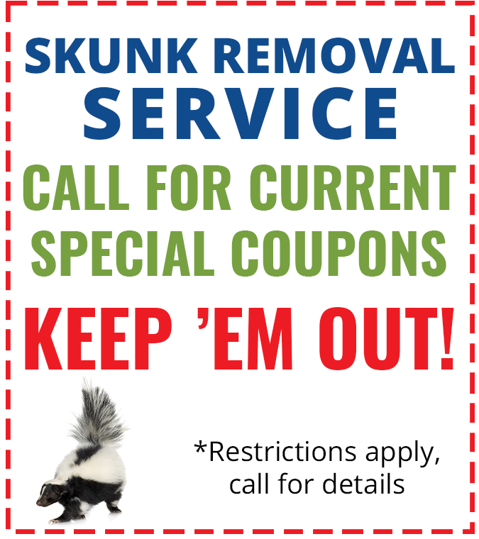 If you are experiencing a skunk problem, please don’t get sprayed! It’s no fun! Call us so we can help! We specialize in locating and removing skunks from homes, structures, properties and attics.